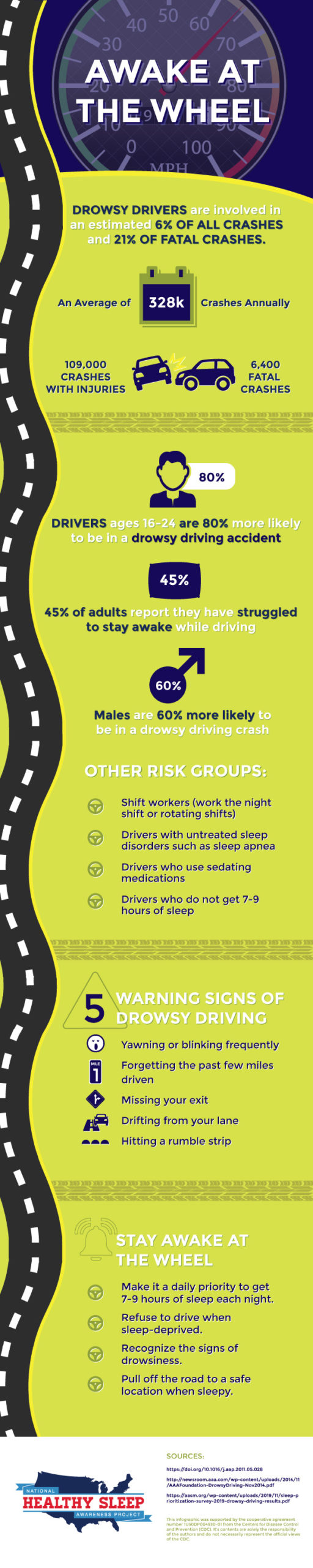 The National Healthy Sleep Awareness Project urges every driver to take responsibility for staying “Awake at the Wheel” by: