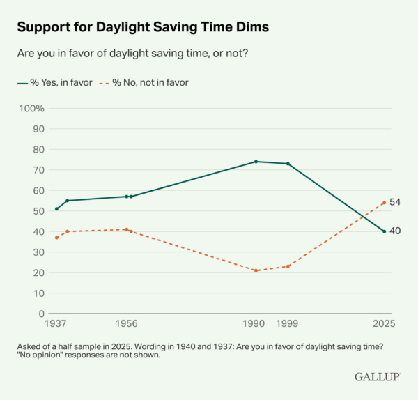 Additionally, a 2025 Gallup poll found that 54% of Americans oppose daylight saving time, a significant decline from 73% support in 1999. The survey also revealed that 48% prefer standard time year-round, while 24% favor permanent daylight saving time and 19% support the current biannual clock changes.